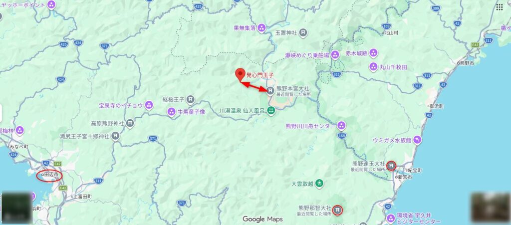 熊野本宮大社から発心門王子までのバス情報などは、下記のGoogleマップを操作すれば確認できますよ▼